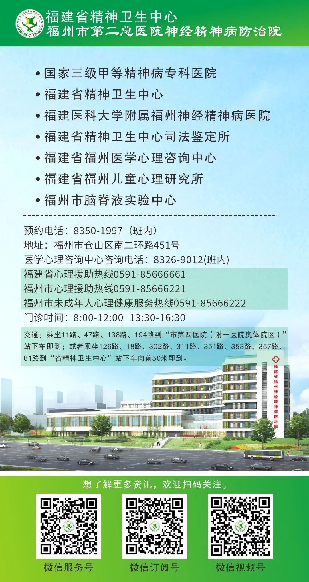 二、2023年11月13日(周一)起,咨詢中心診療業(yè)務在福州市第二總醫(yī)院神經精神病防治院開展。