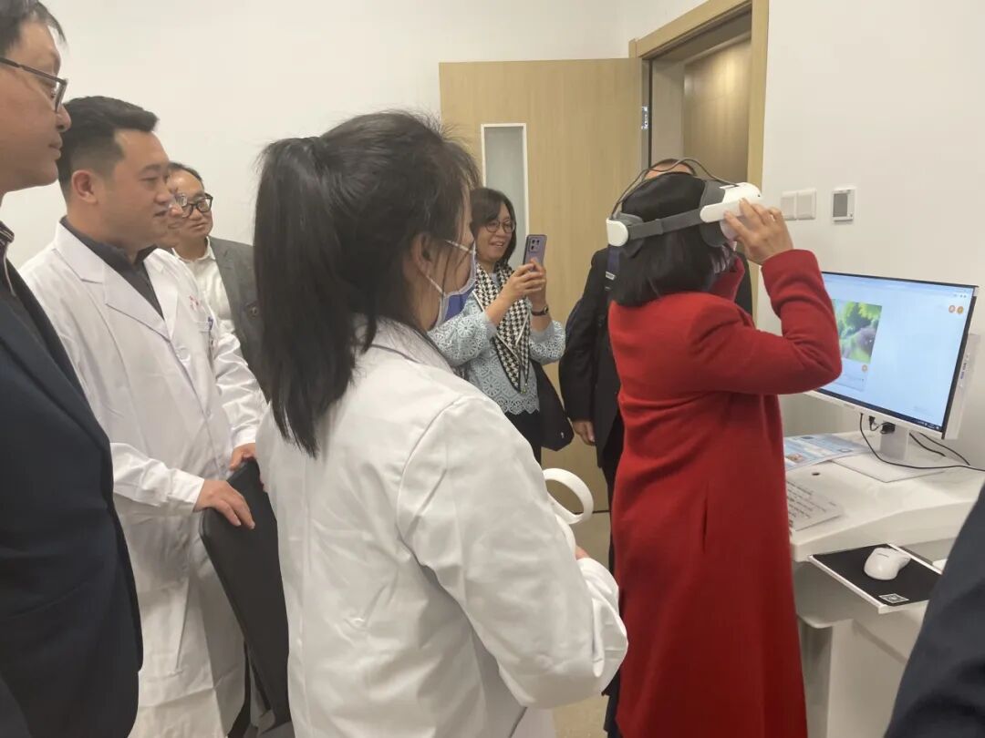 陳慧慈校長一行先后參觀了門診部、病區(qū)以及心理康復(fù)中心等,并現(xiàn)場體驗(yàn)了VR技術(shù)。