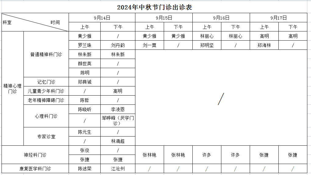一、中秋節(jié)放假時(shí)間為:2024年9月15-17日,共3天,9月14日(周六)按照周一安排門診和心理治療,專家門診照常進(jìn)行,普通門診正常上班。